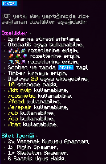 • VIP yetki alımı yaptığınızda size sağlanan özellikler aşağıdadır.